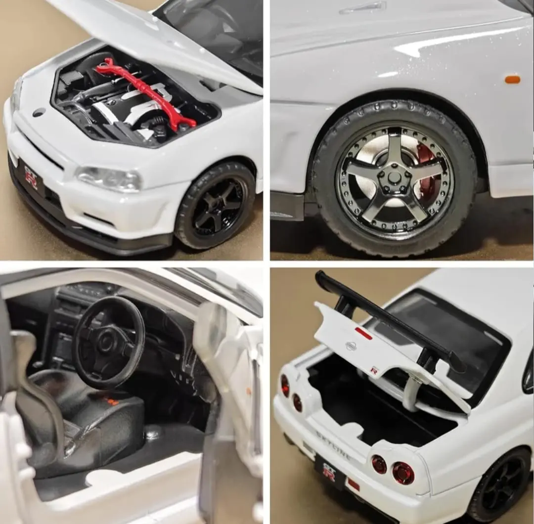 Functional Elements: The model includes an opening hood, doors, and trunk. Under the hood, there is a miniature representation of the RB26DETT engine, complete with a visible strut tower bar.