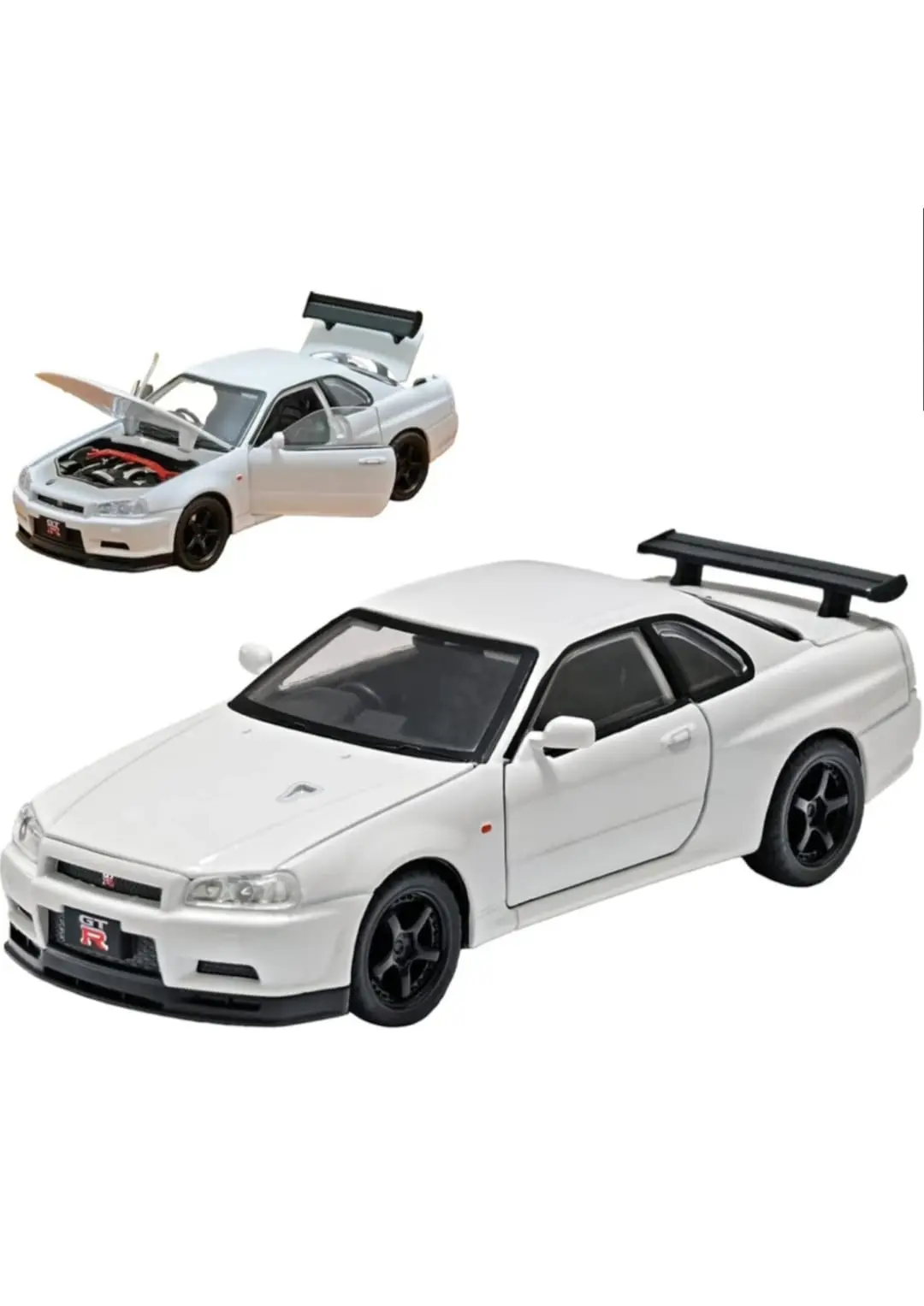 This is a detailed die-cast scale model of the legendary Nissan Skyline GT-R (R34). The model captures the iconic silhouette of the Japanese sports car, featuring its signature aggressive front fascia, aerodynamic body lines, and high-mounted rear wing.