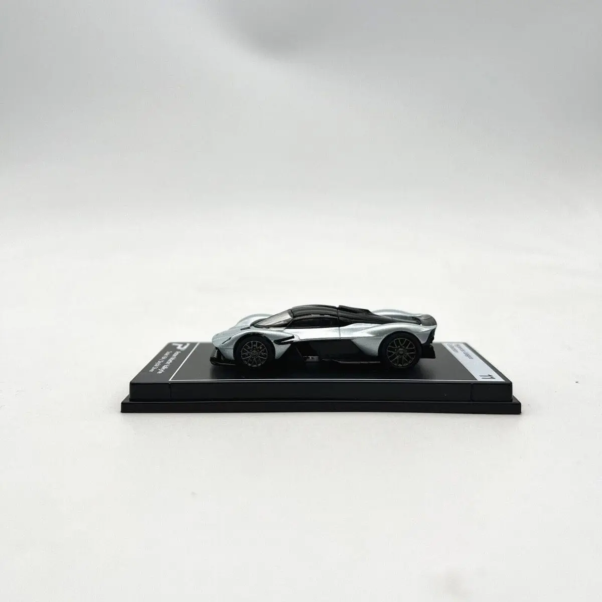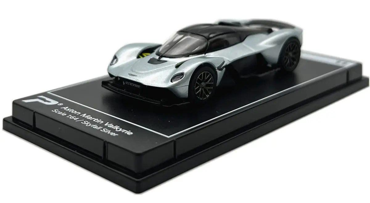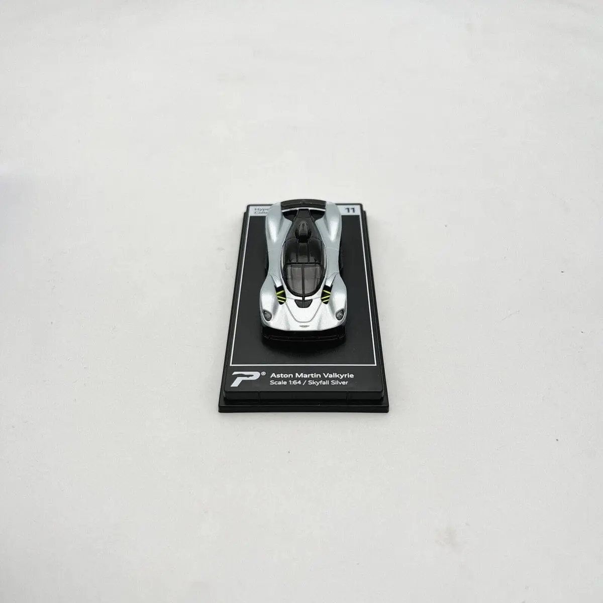 This is a 1:64 scale diecast model of an Aston Martin Valkyrie in Skyfall Silver from the PosterCars “Hypercar League Collection”.