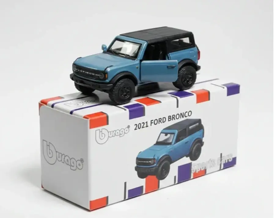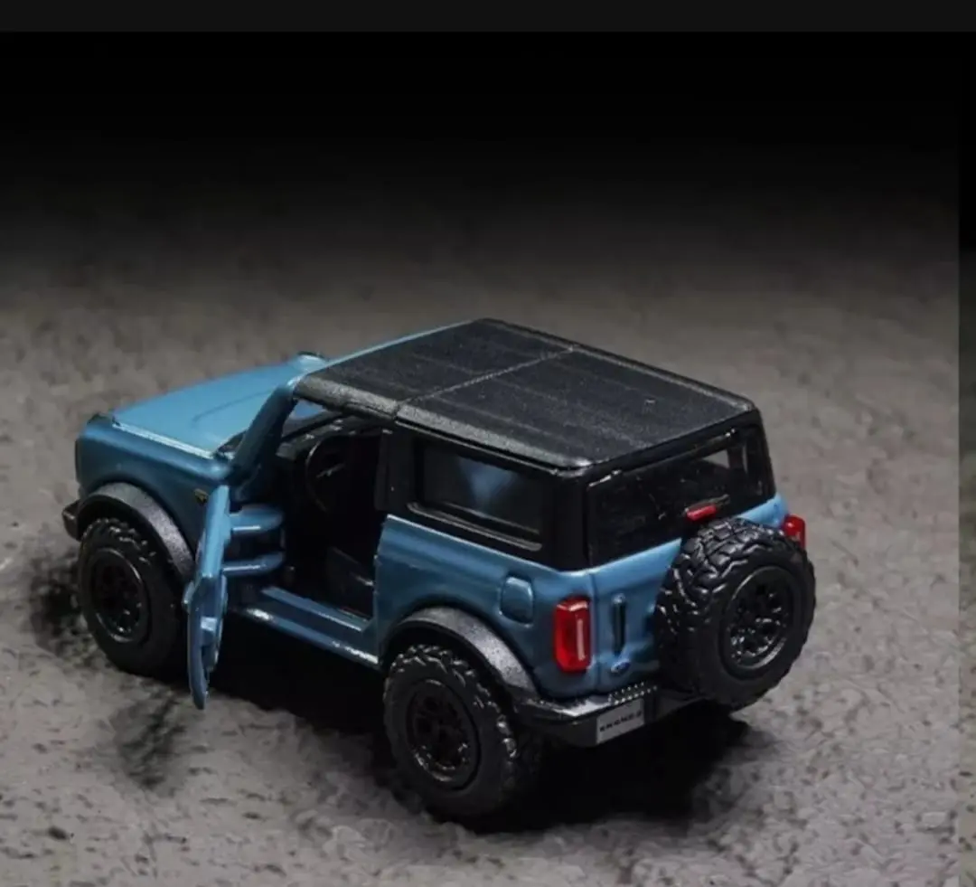 This image features a die-cast model of the 2021 Ford Bronco in a muted “Area 51” blue or cactus grey shade.