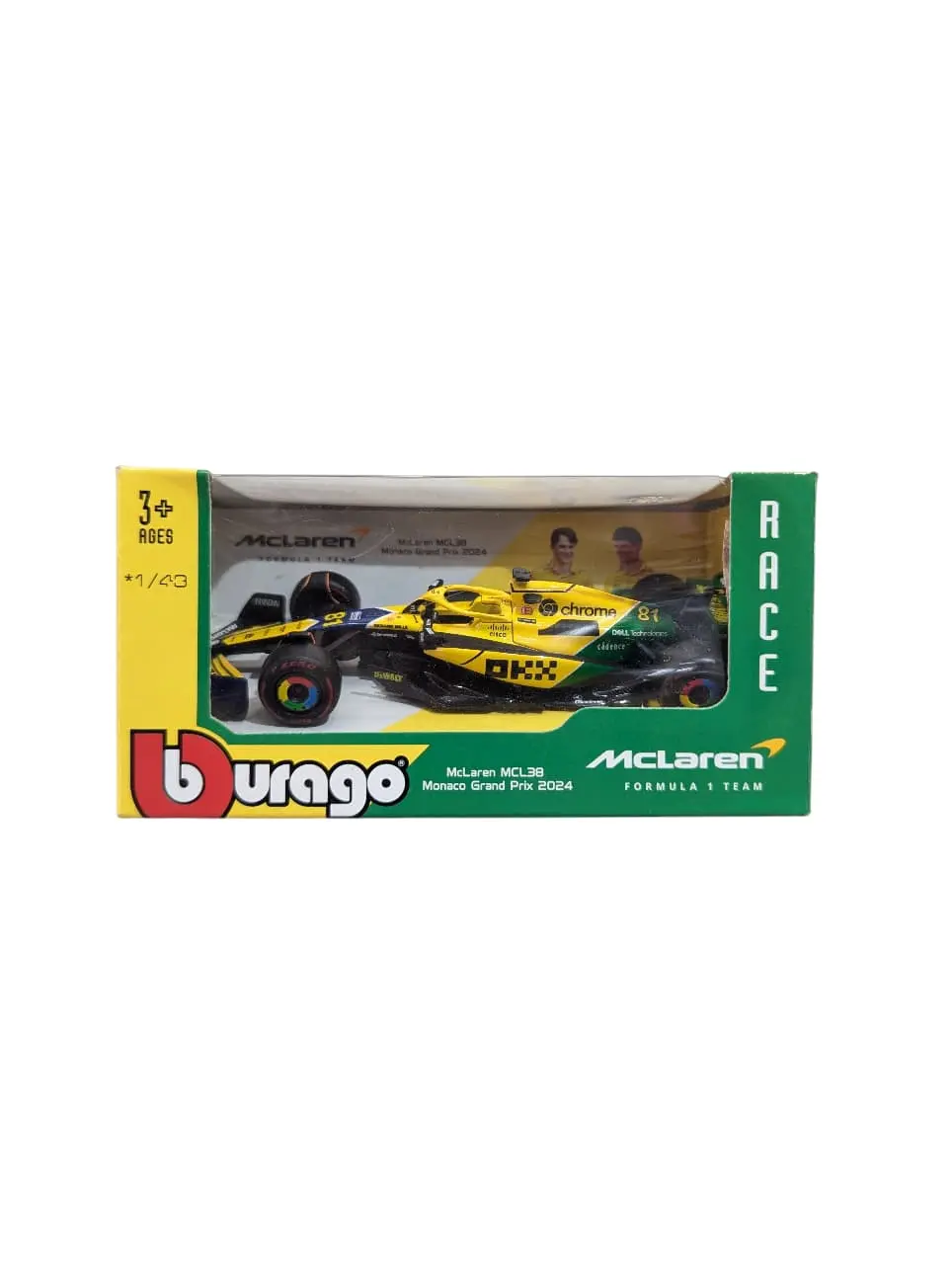 Packaging: It comes in a branded window box featuring images of the drivers (Oscar Piastri and Lando Norris) and official McLaren Formula 1 Team branding.