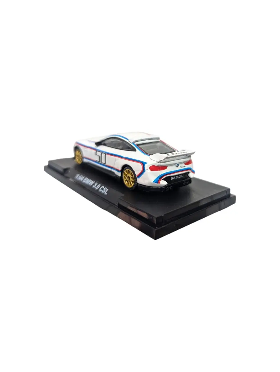 * **Signature M Livery:** The model is finished in Alpine White, accented by the classic BMW M tri-color stripes (blue, purple, and red) that sweep across the bodywork, mirroring the real-life limited-edition car.