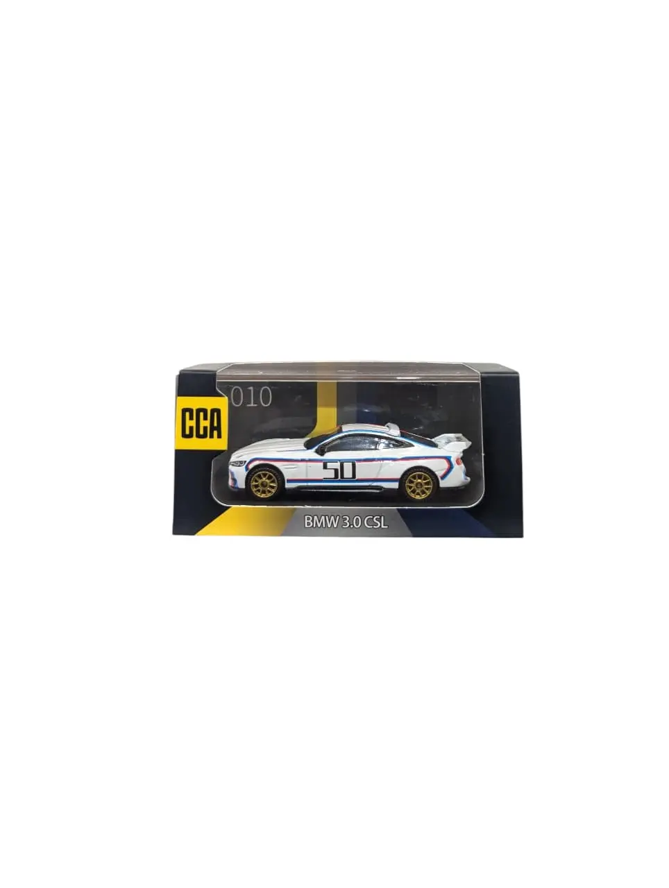 This die-cast model features the **BMW 3.0 CSL**, a modern tribute to the “Batmobile” racing legends of the 1970s. Produced by **CCA (Cool Car Arena)** in 1:64 scale, this model (numbered **010**) celebrates the 50th anniversary of BMW’s M division with its iconic racing aesthetics.