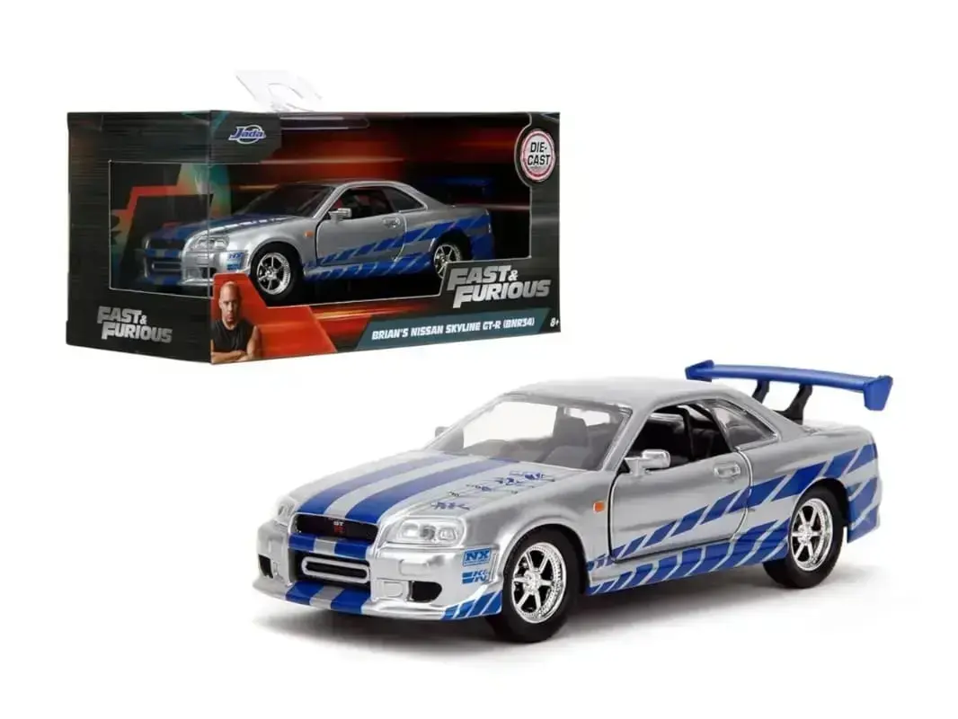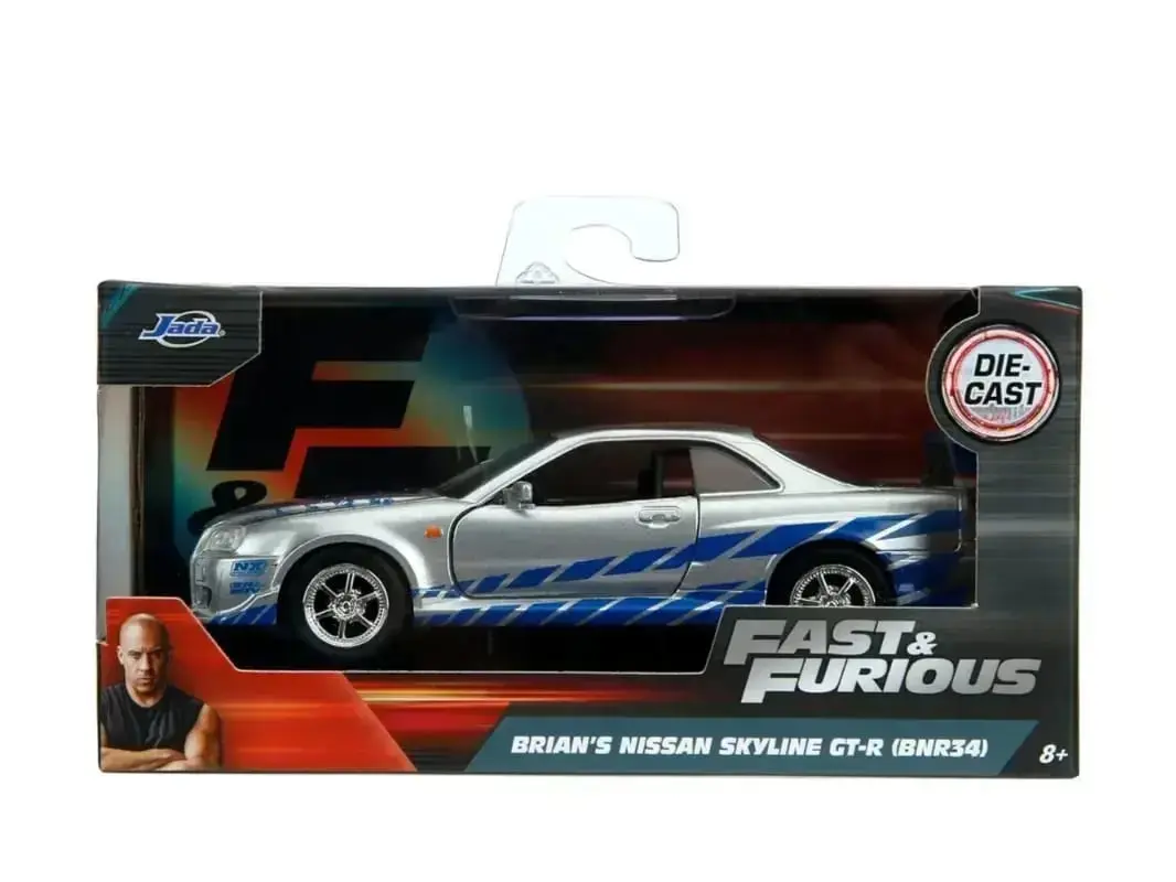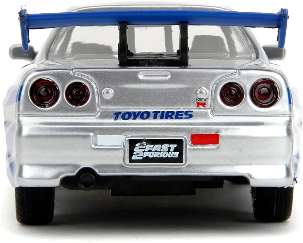 This is a detailed 1:32 scale die-cast replica of **Brian O’Conner’s Nissan Skyline GT-R (BNR34)**, produced by **Jada Toys** as part of their *Fast & Furious* collection. This specific model celebrates the iconic silver and blue tuner car featured in the opening sequence of *2 Fast 2 Furious*.