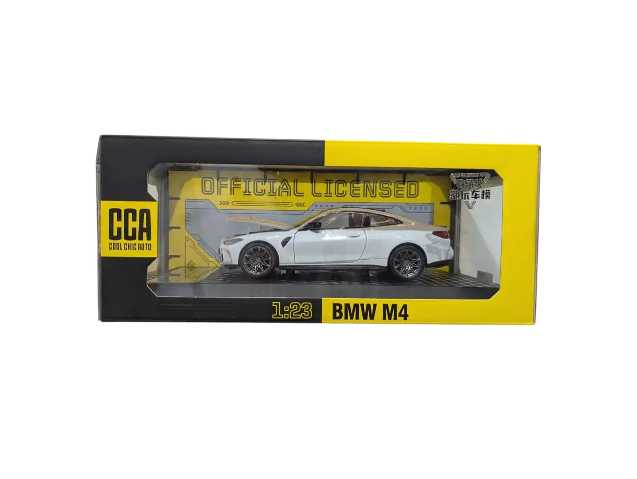 This is a 1:23 scale officially licensed BMW M4 diecast model car by CCA (Cool Chic Auto), beautifully presented in a premium display box.