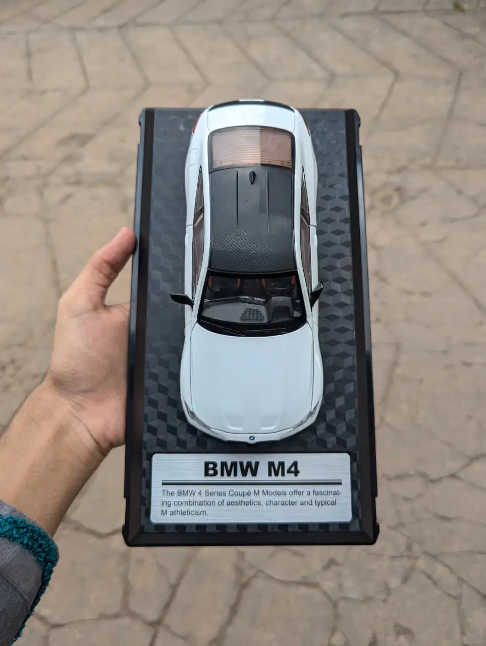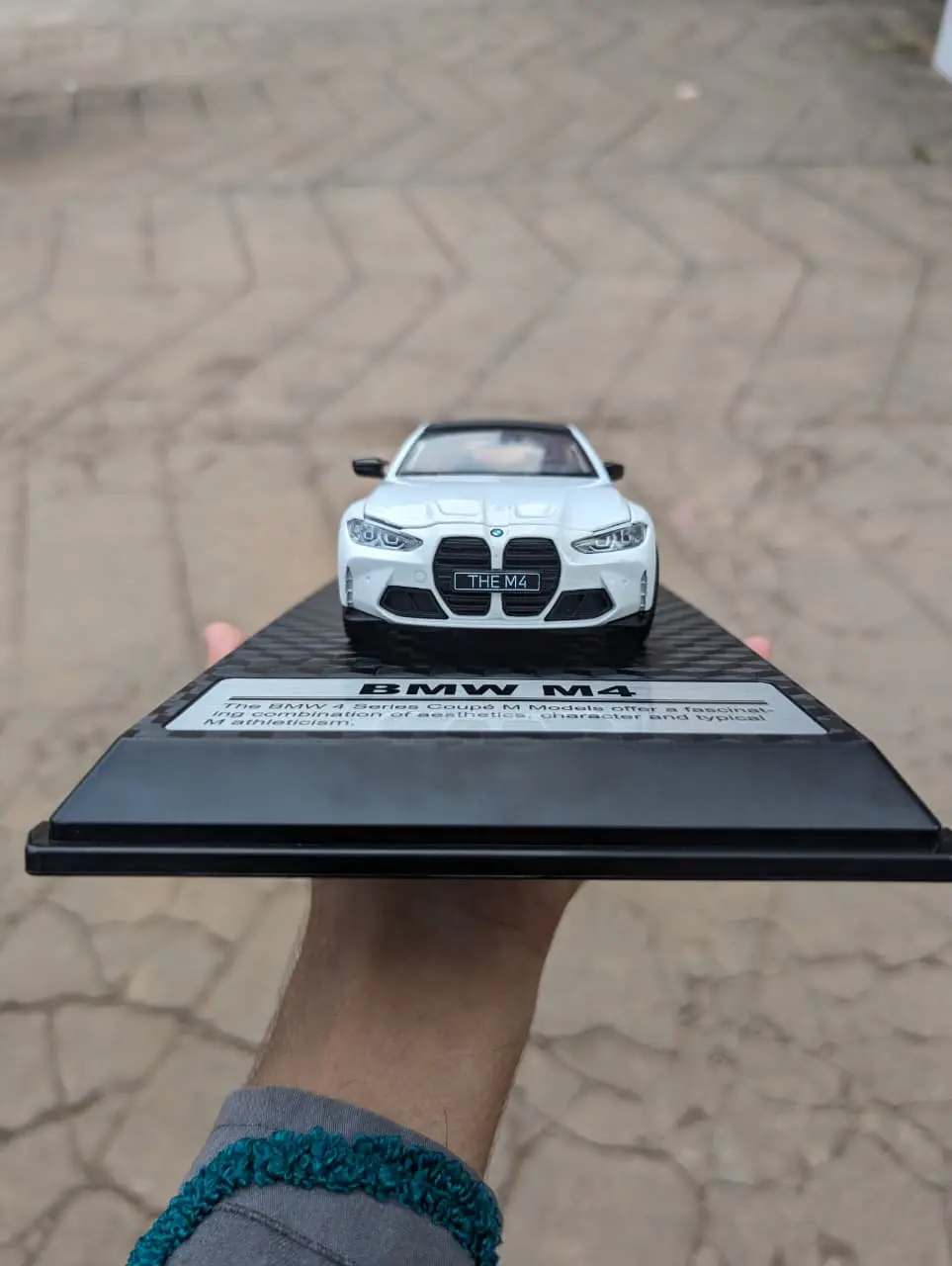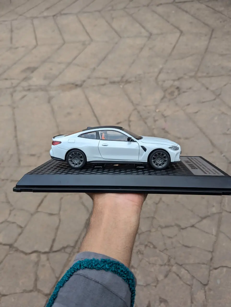 Finished in a sleek white color, this detailed replica captures the aggressive styling of the M4 with precision — featuring the signature sporty coupe silhouette, sharp body lines, sporty alloy wheels, detailed headlights, and realistic interior. The model showcases the bold front design and performance-inspired stance that makes the BMW M4 a true icon.