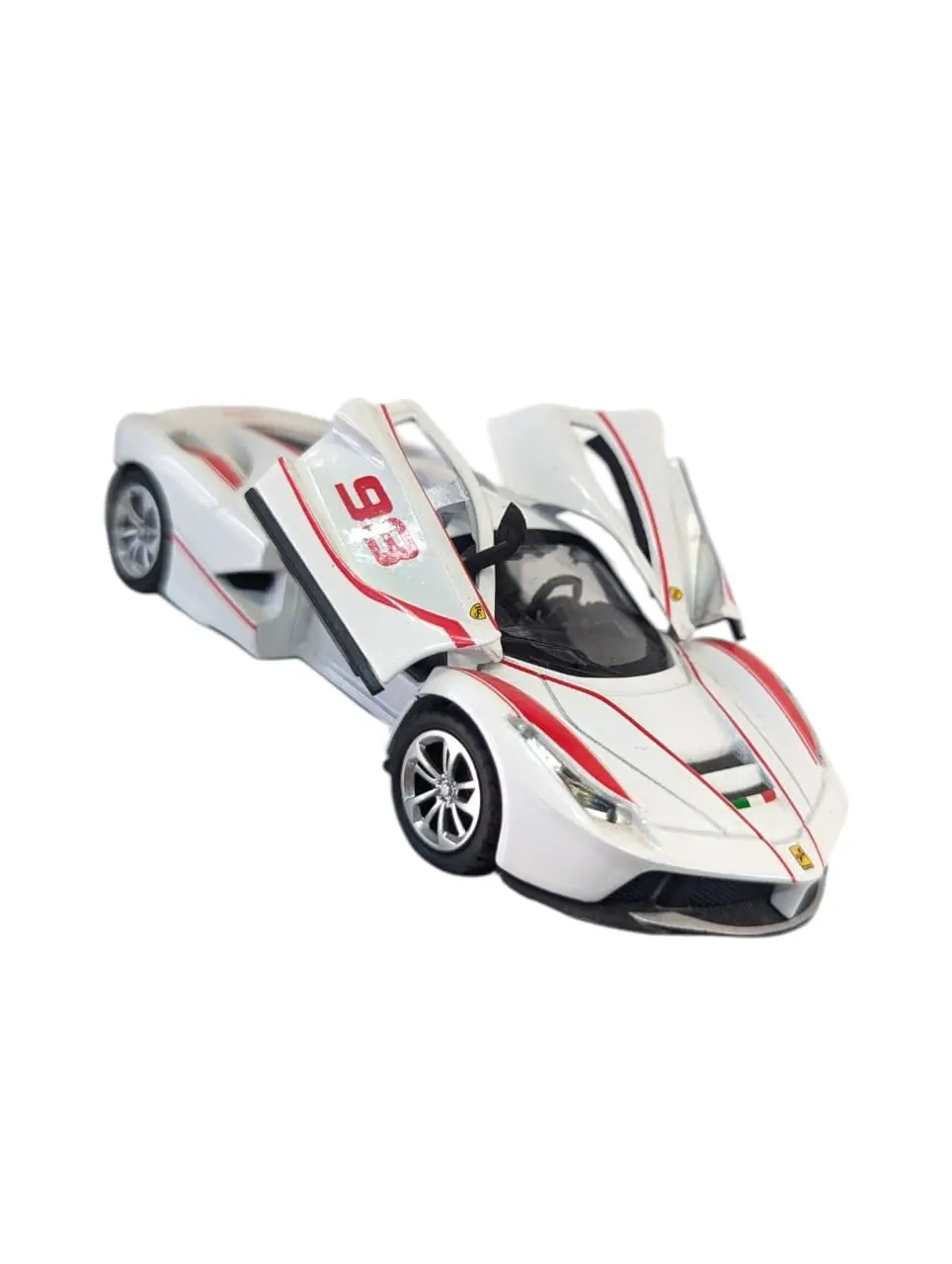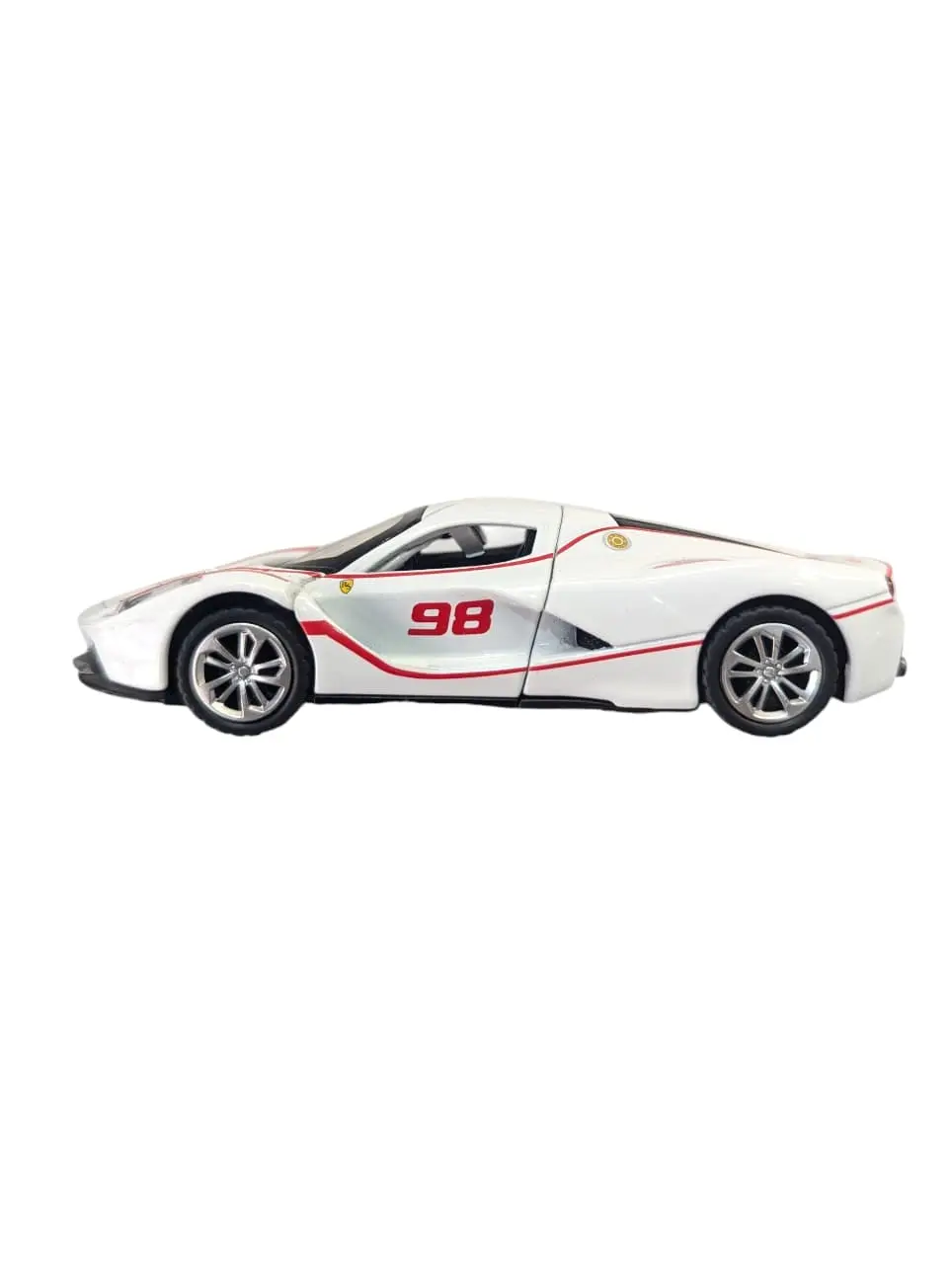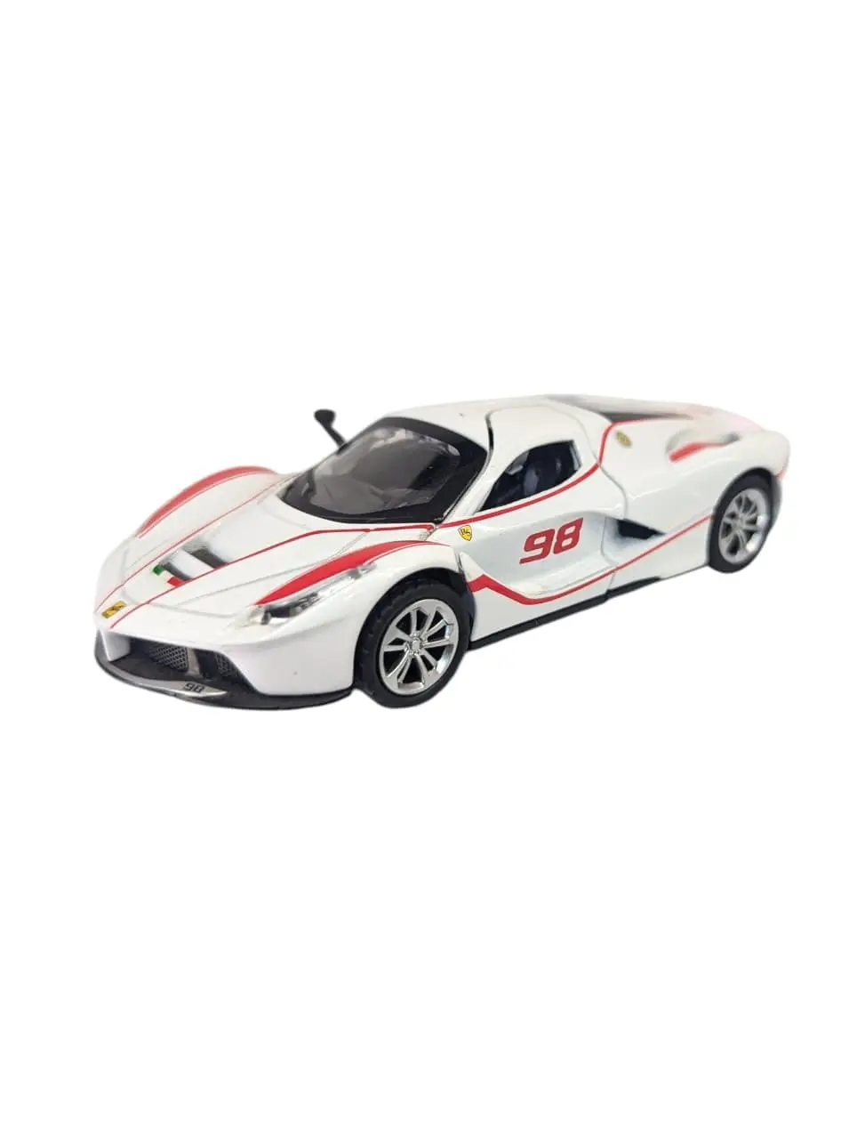 This is a 1:32 scale die-cast model of a Ferrari LaFerrari. It is captured in a striking white and red livery, featuring the race number “98” prominently displayed on the doors.