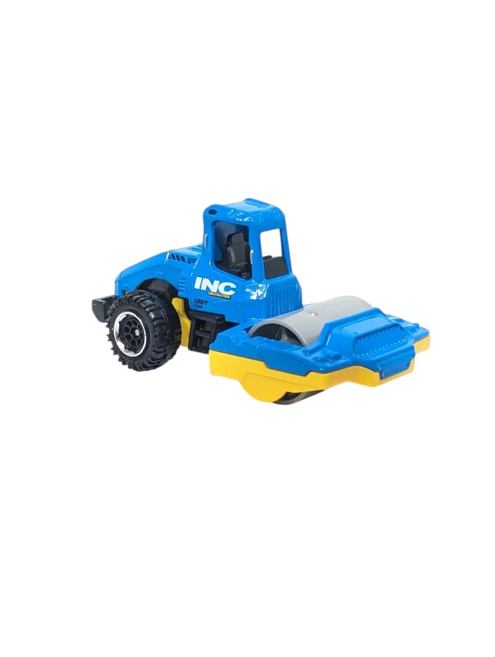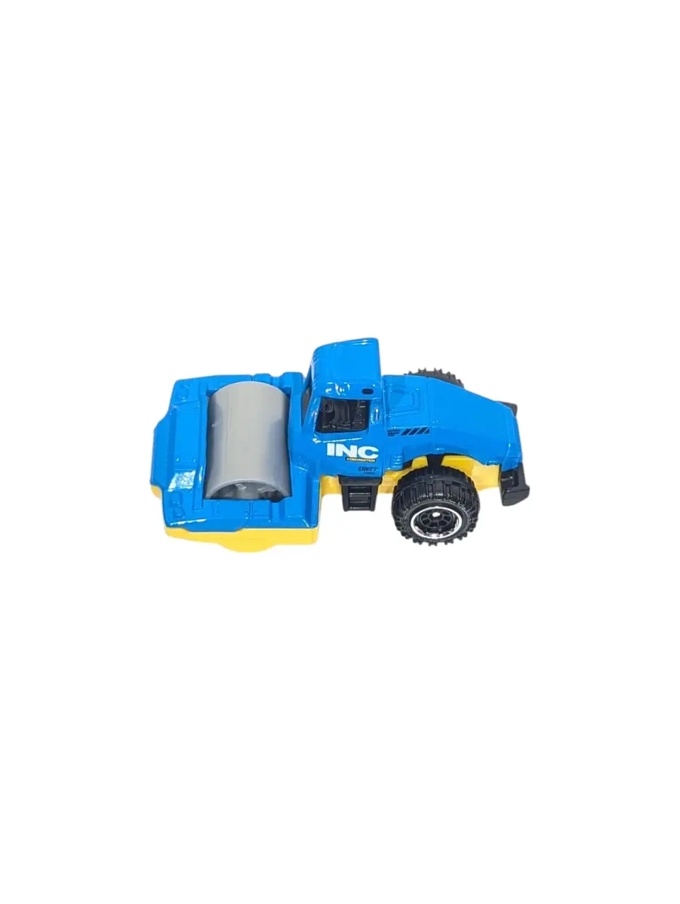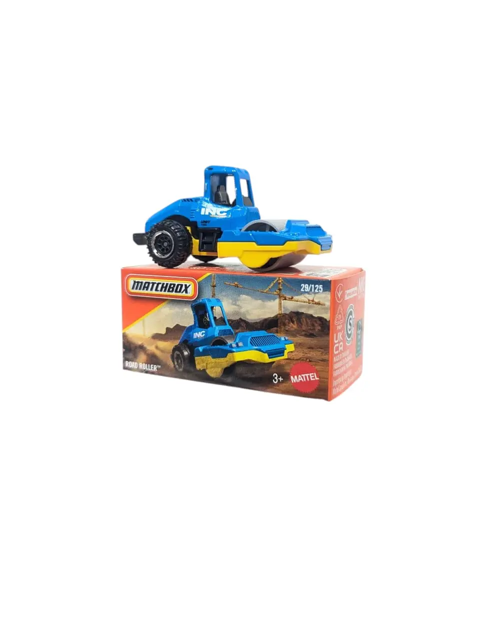 This is a compact die-cast construction vehicle from Matchbox, featuring a detailed road roller design. The model comes in a vibrant blue body with contrasting yellow roller and base, giving it a bold, eye-catching look. It includes realistic elements such as textured wheels, a front rolling drum, and a small operator cabin, capturing the essence of a real construction road roller.