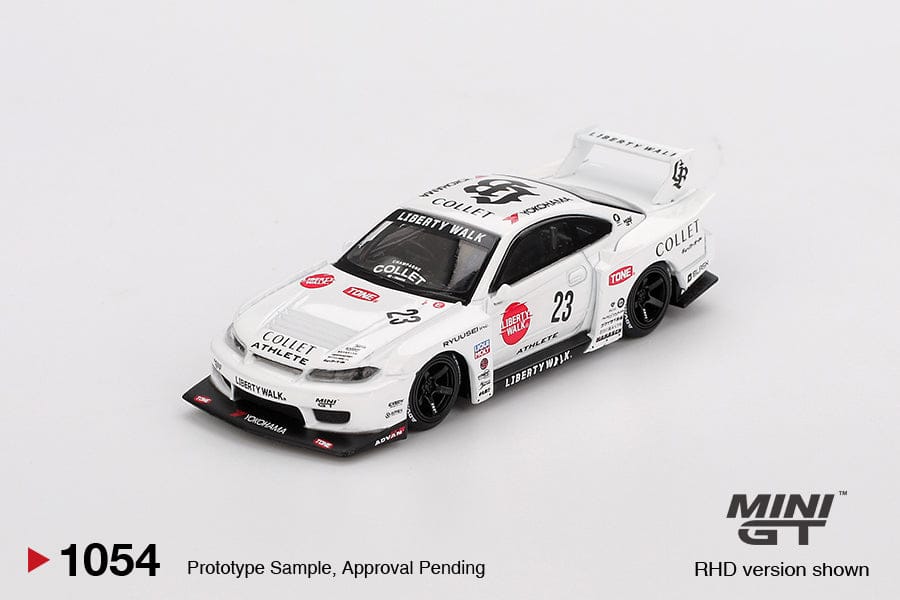 This is a stunning 1:64 scale diecast model by MINI GT, showcasing the iconic Nissan Silvia S15 Liberty Walk Edition in a clean white racing livery.