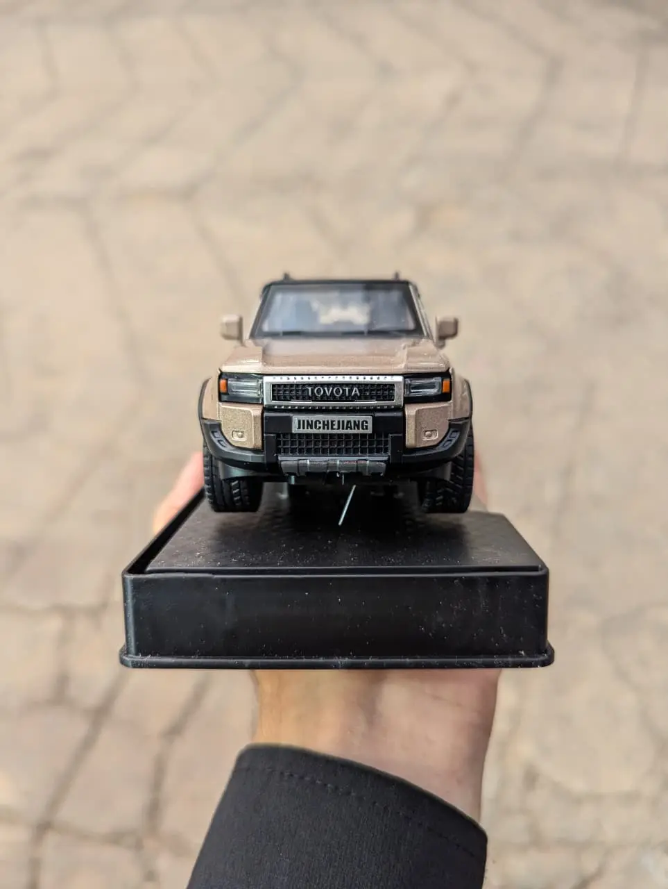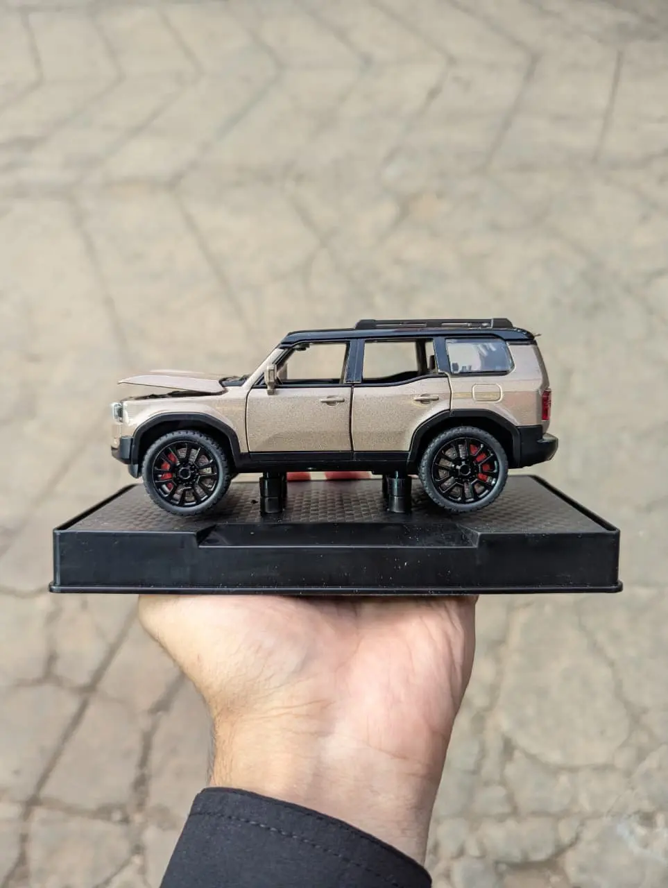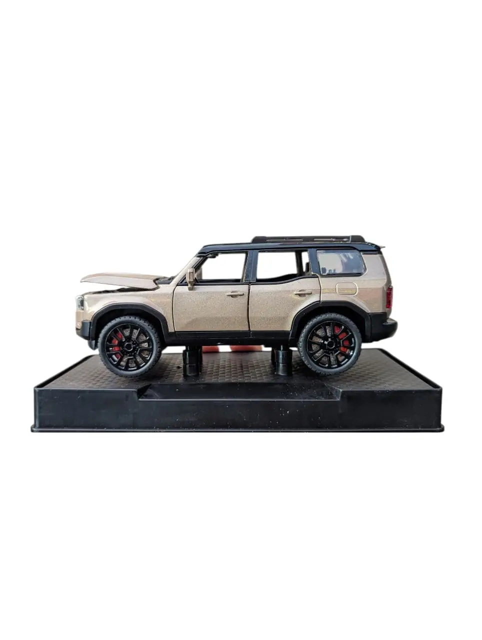 This item is a 1:32 scale die-cast metal toy model of a brown Toyota Land Cruiser 250 Prado.